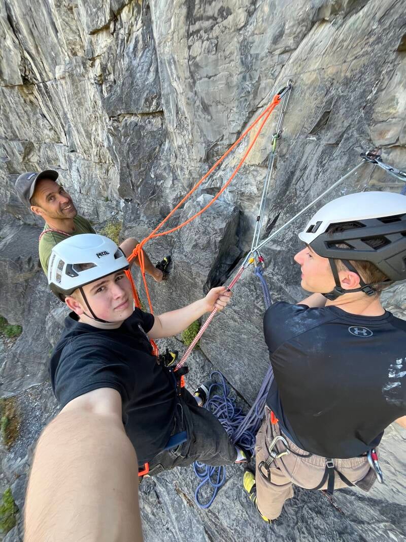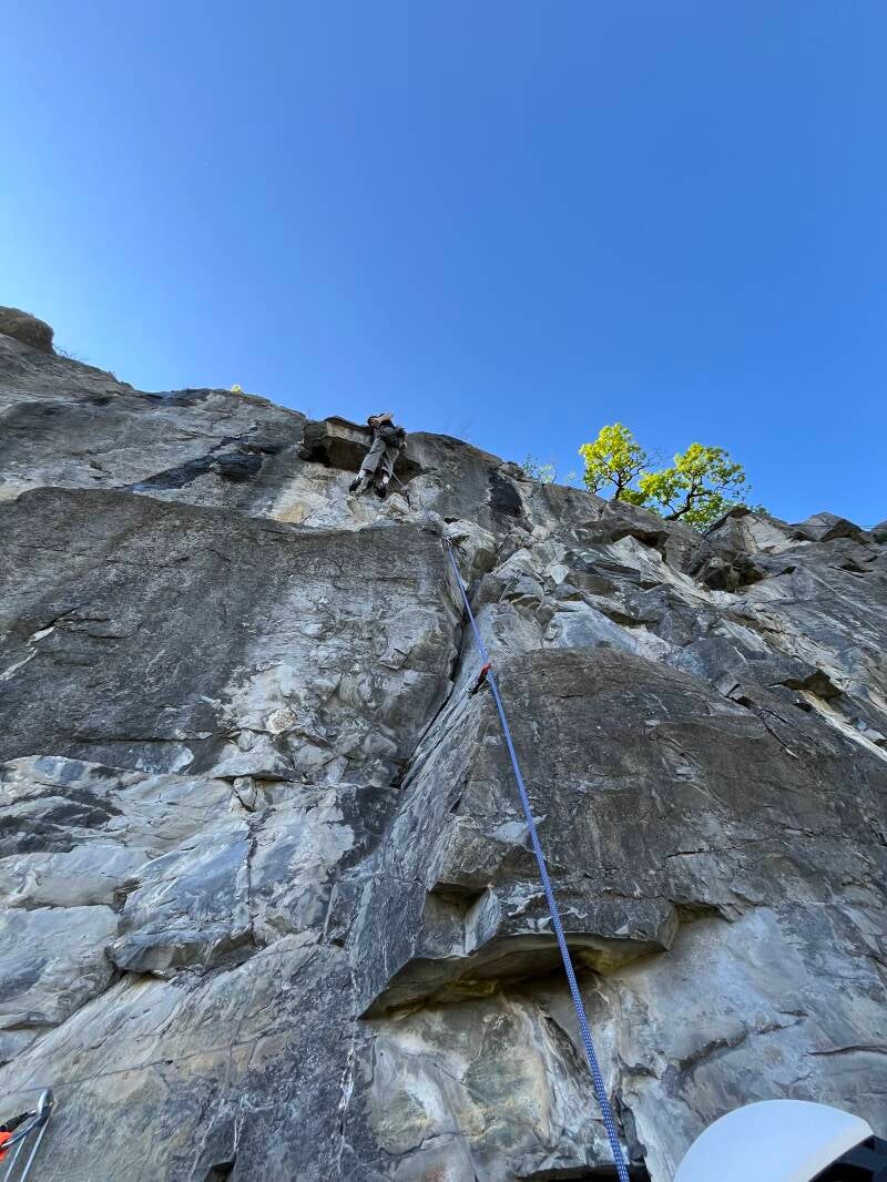 Une fois redescendus nous avons décidés de faire une voie en deux longueurs avec un relai au milieu pour les apprendre et les maitriser, j'ai fait les deux parties de 6a+ en tête et j'ai adoré les voies, elles étaient vraiment belles et difficiles juste comme il faut, puis j'ai rejoint mon prof au relai pour qu'il me montre comment assurer Enzo qui grimpait en second a l'aide d'un reverso.