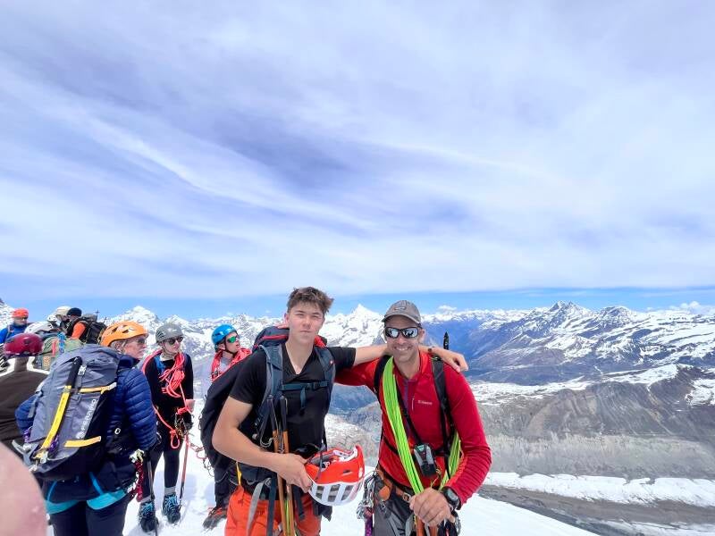 Il y avait pas mal de monde au sommet et nous avons réfléchi à traverser une arête neigeuse pour accéder au Breithorn central, mais le manque d'expérience dans ces conditions et le fait de devoir porter nos skis sur le dos pour la traverser nous ont un peu découragés. Vincent ne se sentait pas très bien non plus, à cause d’une crève qu’il avait attrapée quelques jours avant le départ, et nous avons donc décidé de redescendre.