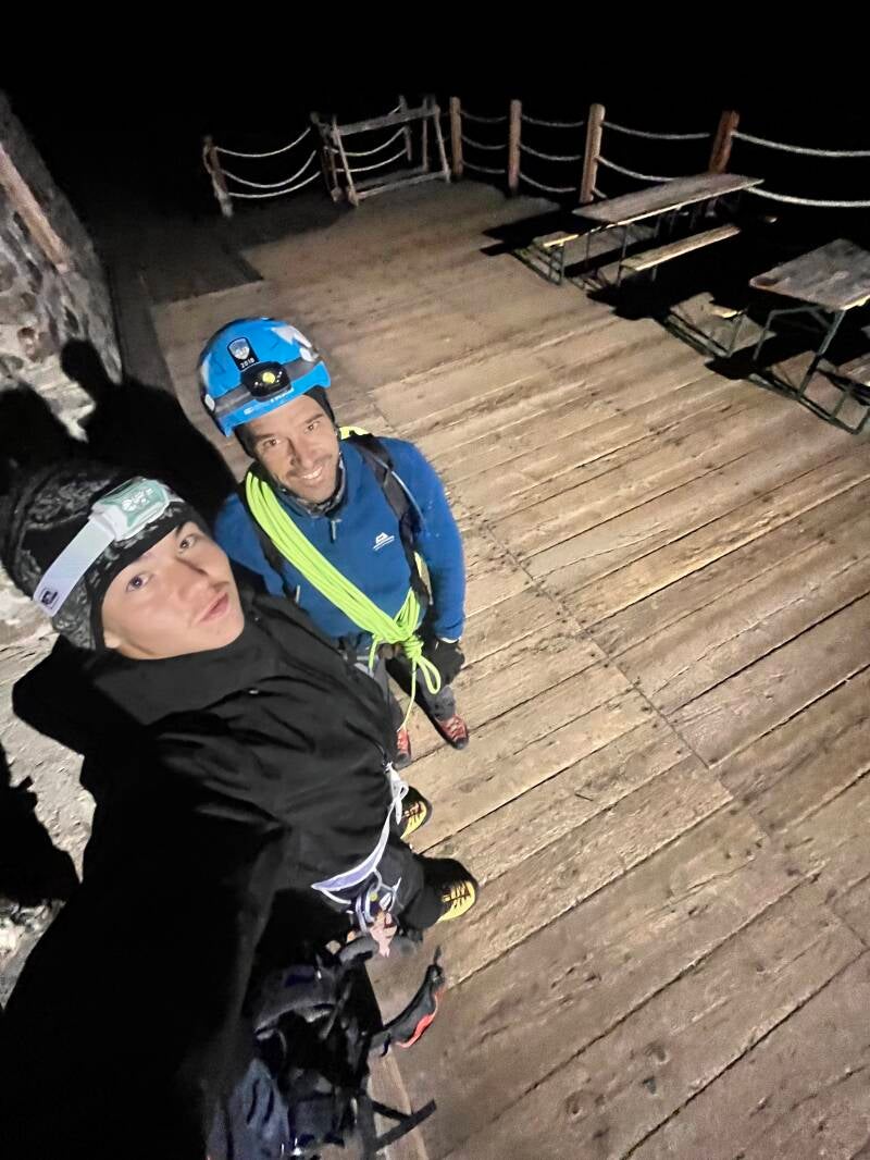 La première nuit s’est bien déroulée malgré un dortoir bruyant. Réveil vers 3 h 45 : petit déjeuner, chaussures, matériel vérifié, et nous voilà dehors dans la nuit noire, froide mais dégagée. Nous avons progressé sur environ 300 m de pierrier en chaussures avant de rejoindre la neige, où nous avons chaussé les crampons, sorti la corde et la caméra.
