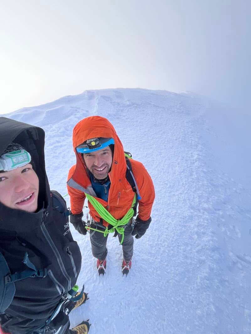 Nous sommes redescendus rapidement, puis avons pris la direction du Corno Nero (4321 m). Une petite heure plus tard, nous étions à la rimaye. Vincent a tiré une longueur en tête sur un névé raide (60°) en neige dure. Je l’ai rejoint, assuré d’en haut, piolet en main, avant d’attaquer l’arête en dry (grimpe avec crampons sur rocher). Après quelques passages vertigineux, j’ai atteint le sommet, dominant une face sud qui tombait à pic sur 400 m. J’ai assuré Vincent jusqu’à ce qu’il me rejoigne, et nous avons profité de 20 secondes au sommet avant de faire demi-tour. La désescalade du névé nous a ramenés à la base.