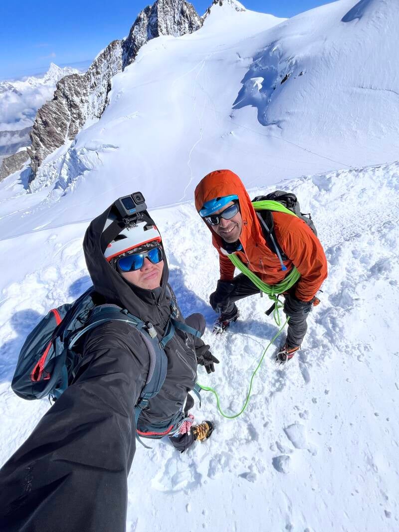 Ensuite, cap sur la Pointe Parrot (Parrotspitze, 4434 m). Après une cinquantaine de mètres de montée, nous avons attaqué l’arête effilée menant au sommet, tombant raide de chaque côté. Ici, pas de droit à l’erreur : trente minutes de concentration absolue nous ont conduits au sommet. Après une photo, nous avons continué sur l’arête avant de redescendre de l’autre côté. Ce fut une belle première expérience d’arête de neige.