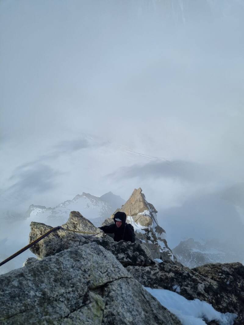 Vincent m’a fait passer en premier pour franchir l’arête, et je l’ai passée assis à califourchon sur la pierre verglacée.