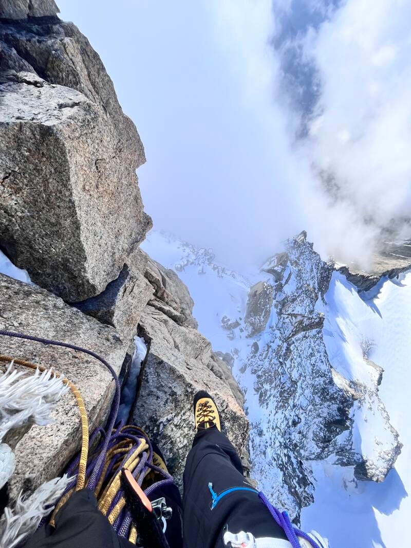 Nous avons sorti le piolet pour monter un couloir de neige d’environ 30 m et avons progressé en marche et en dry jusqu’au pied de la voie, avec certains passages vraiment impressionnants.